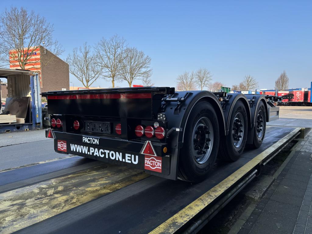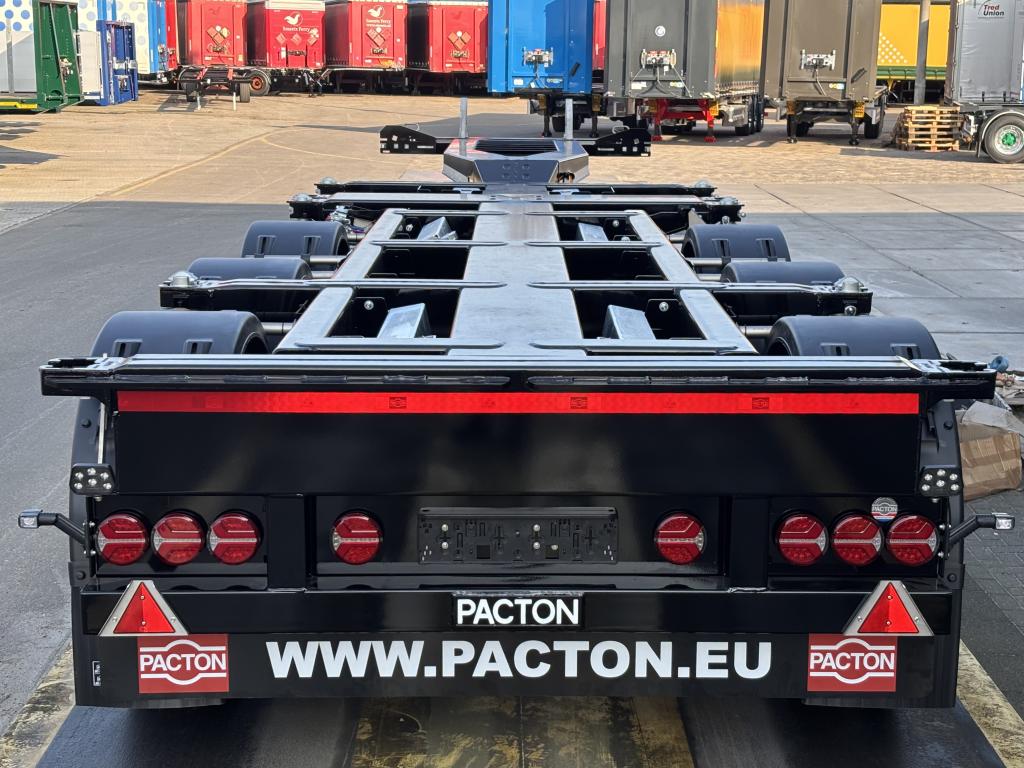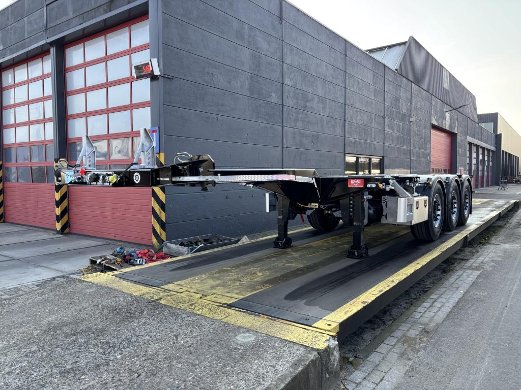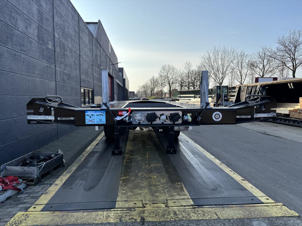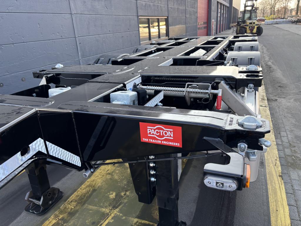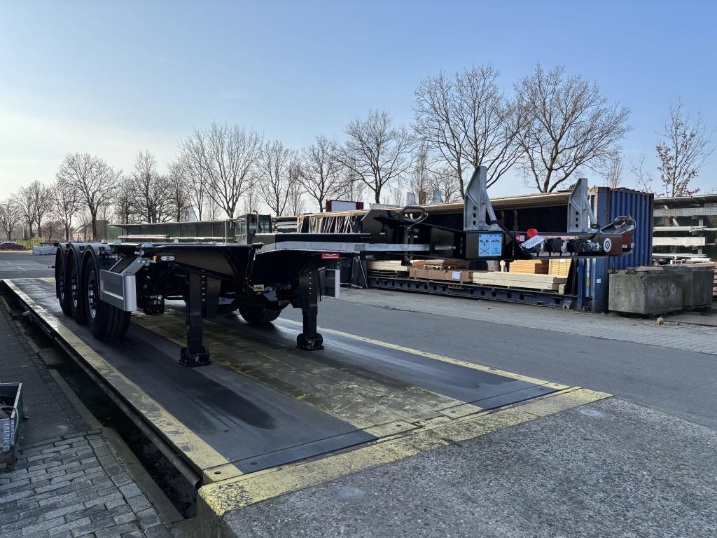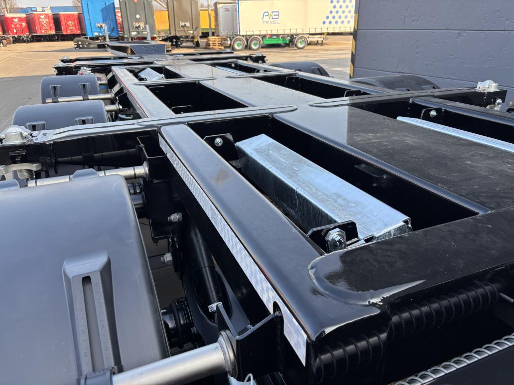 uitschuifbaar containerchassis t.b.v. vlakke of tunnelcontainer 1x20 Ft.achterop,1x20Ft.centraal, 1x30 Ft., 2x20 Ft., 1x40 Ft.,1x45 Ft. (short- en deepsea), 13,6 m.