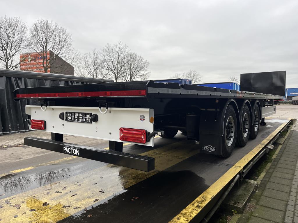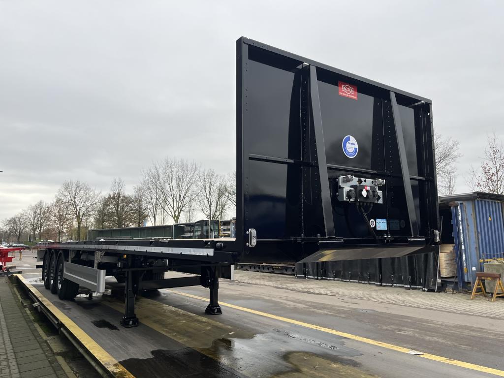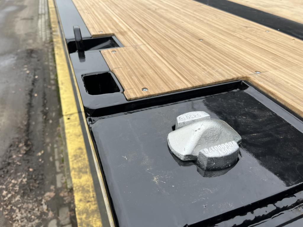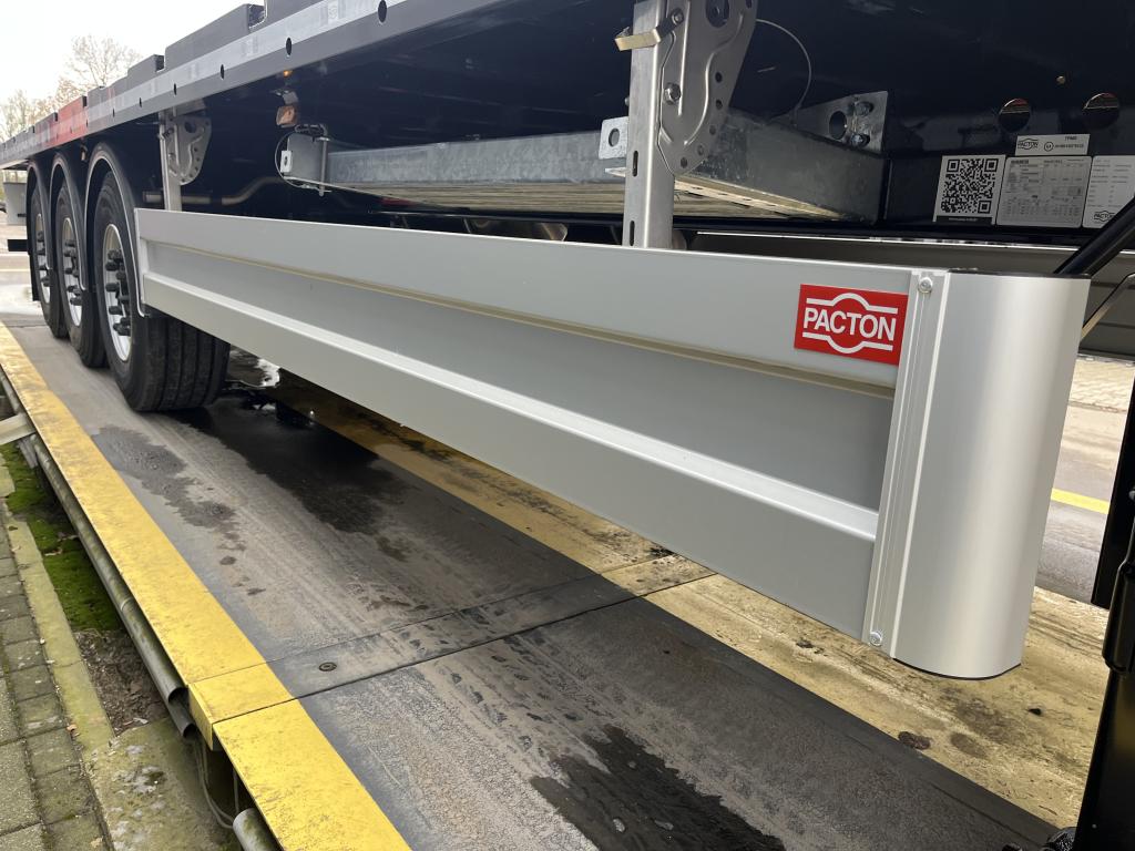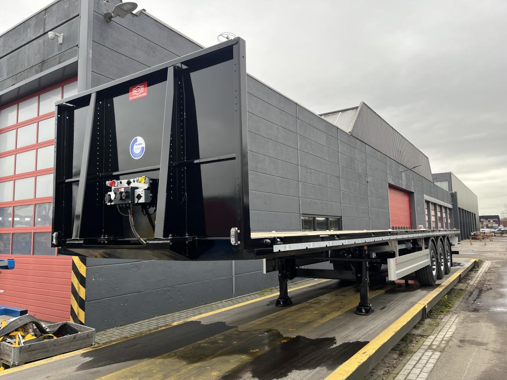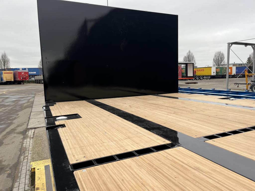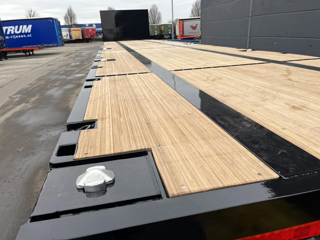 Oplegger is volledig geschoopeerd 12 twistlocks 4 rongenrijen overdwars 2x10 ronggaten in de zijrand Bindoog gaten in zijrand 2x13 8-tons bindogen klapbaar, in de zijrand. 16 losse rongen L= 1245 mm. SAF schijfremmen A-merk banden 385/65 R22.5 Bamboo vloer Volledig voorzien van LED verlichting Actieve knipperlichten